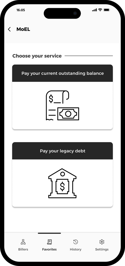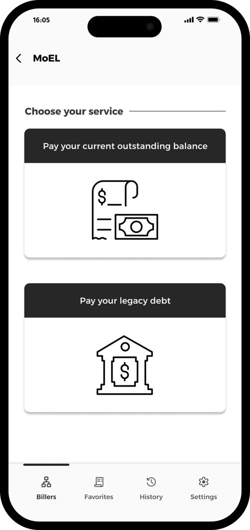 Pick “Legacy Debt” to pay off charges from before you migrated to 24/7 electricity.