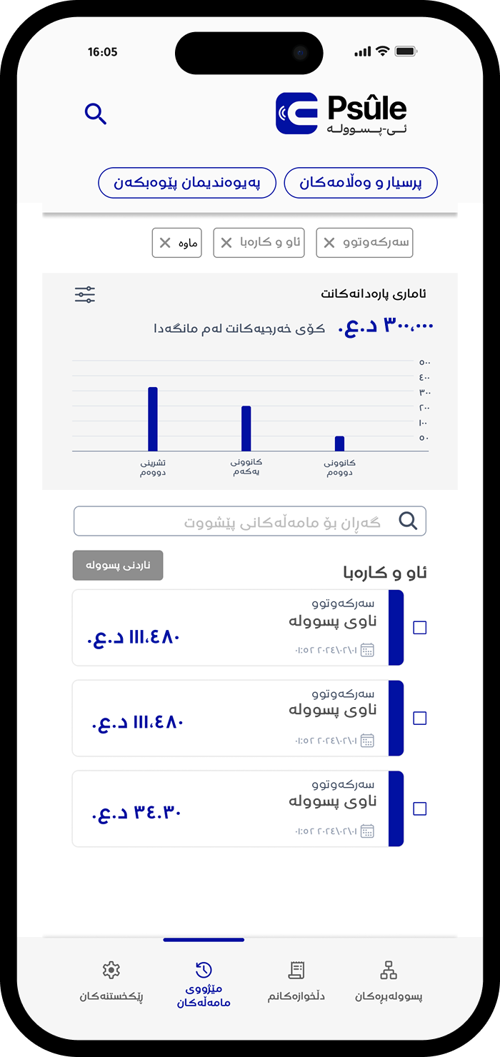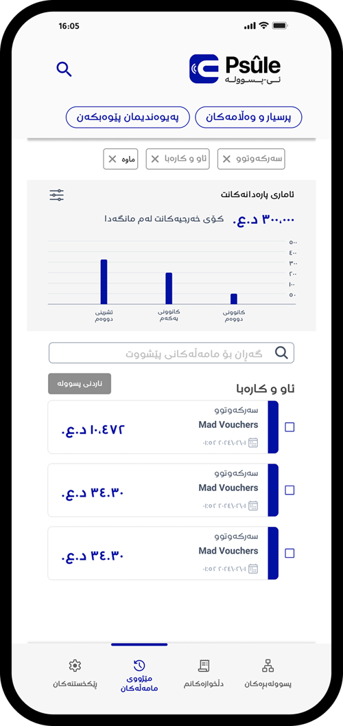 کلیک لەسەر یەکێک لە مامەڵەکان بکە بۆ بینینی وردەکاری پسوولەکەت.