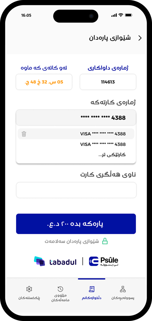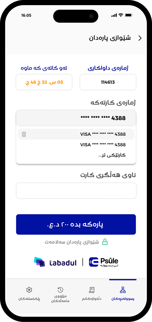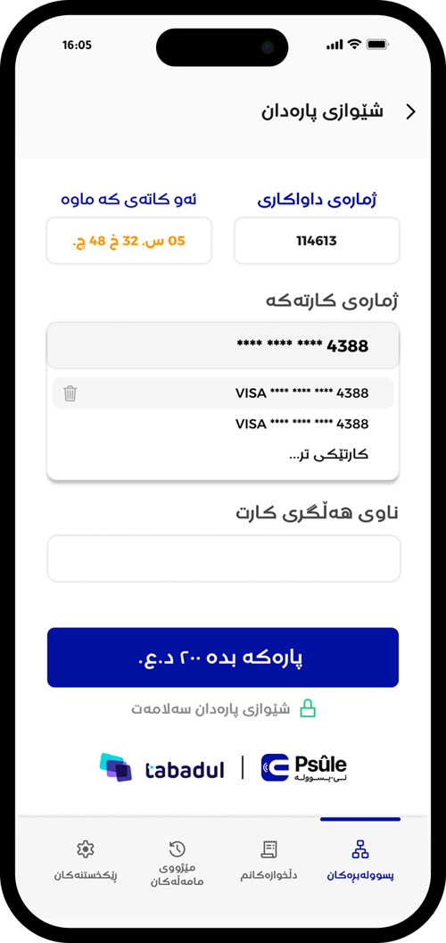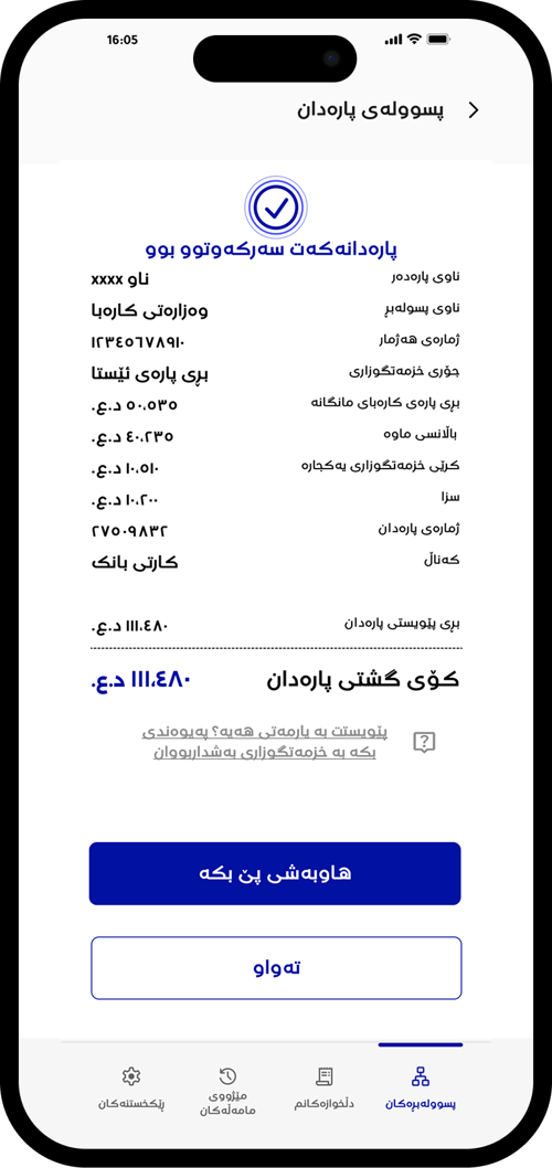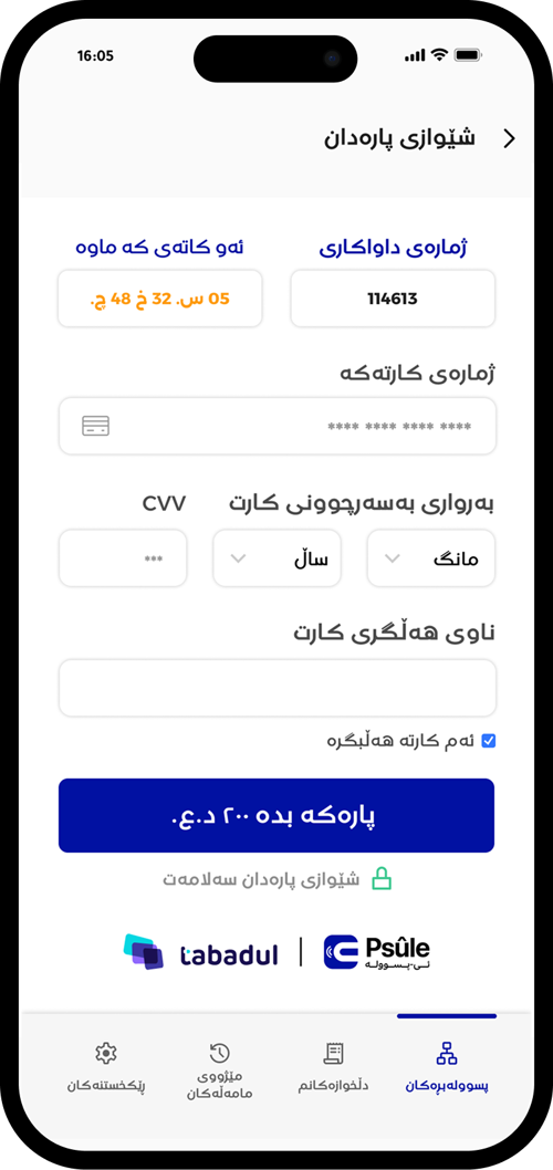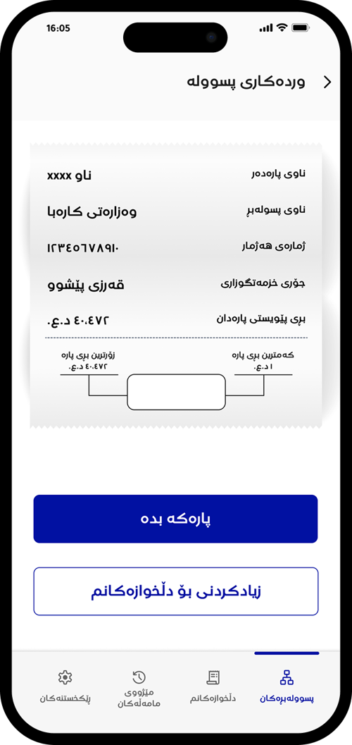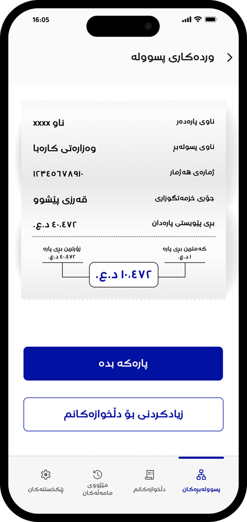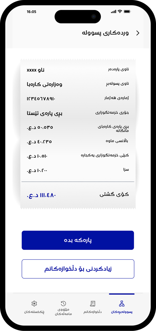 دوای ئەوە "بڕی پارەی ئێستات بدە" هەڵبژێرە بۆ پارەدانی پسووولەی مانگانە یاخود هەر پارەیەکی تر وەکو پارەی خزمەتگوزاری یەکجارە.