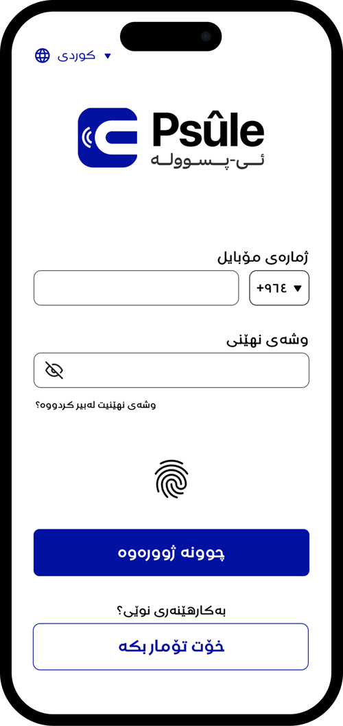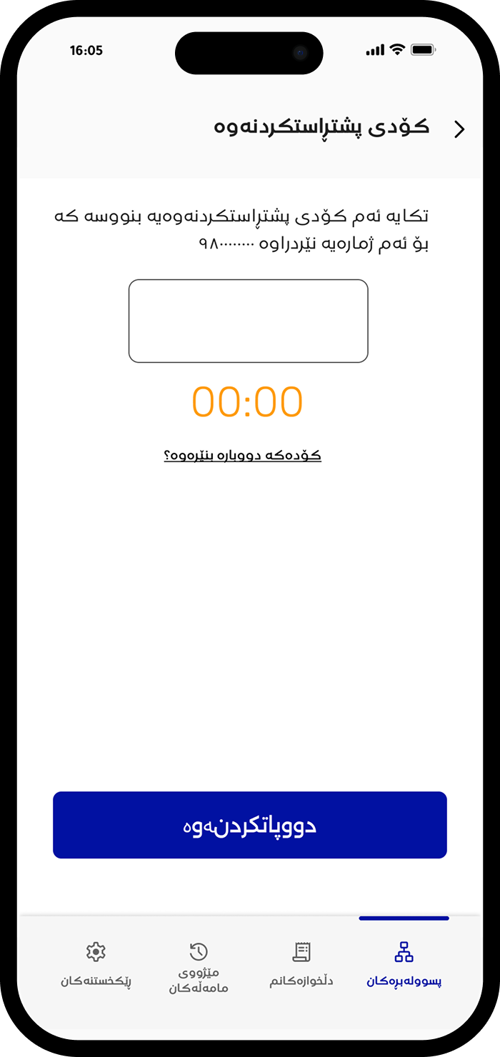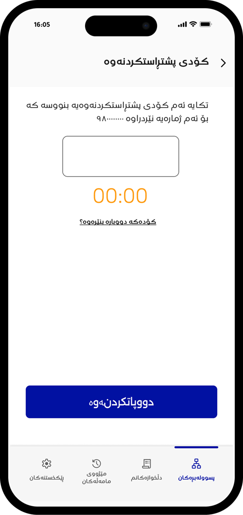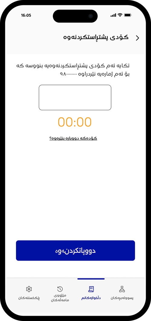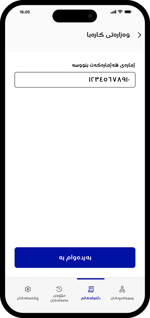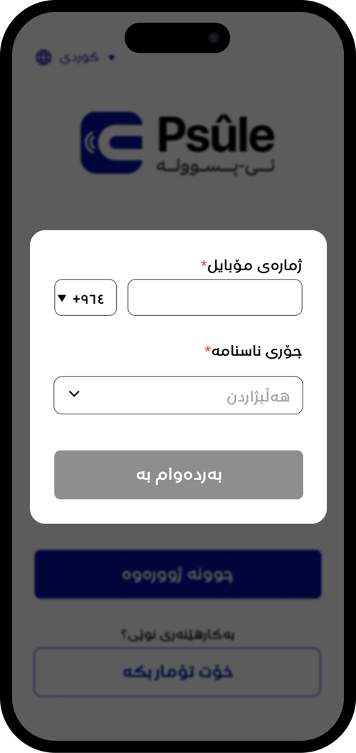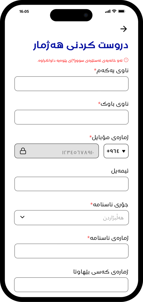 ژمارەی مۆبایلەکەت بنووسە و جۆری ناسنامەکەت هەڵبژێرە و بەردەوام بە دابگرە.