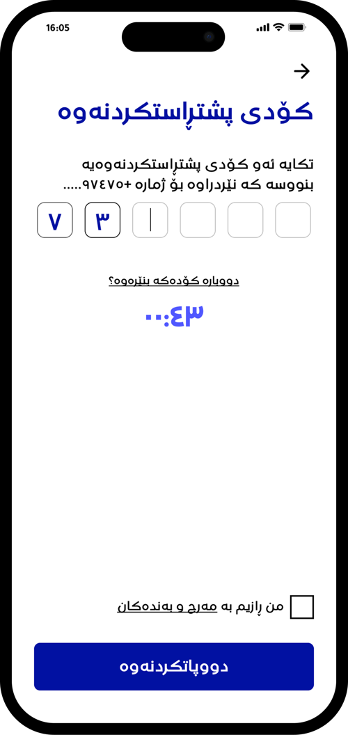 پێداچوونەوە بکە و ڕازی بە بە مەرج و بەندەکان و کۆدی پشتڕاستکردنەوەی نێردراو بۆ مۆبایلەکەت بنووسە.