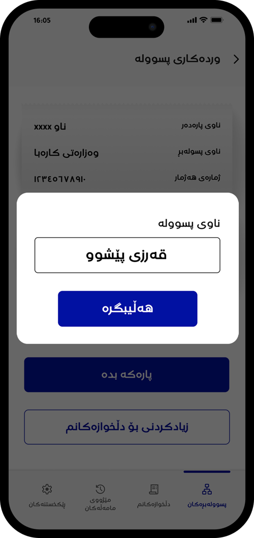 ناوی پسوولە زیاد بکە بۆ هەڵگرتنی پسوولەکەت بۆ داهاتوو.