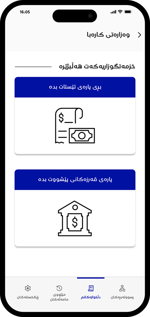 خزمەتگوزاریەک هەڵبژێرە (بۆ نموونە ”بڕی پارەی ئێستات بدە“)